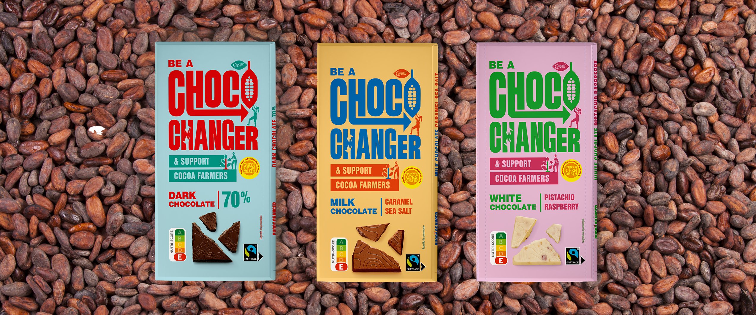 Caramel Sea Salt, Pistachio Raspberry, 70% Dark Chocolate, Honeycomb Nougat*, Caramel Brownie*, and Salty Fudge Almond*—the Choceur CHOCO CHANGER bars—are currently available in various variants at ALDI stores across Europe, Australia, the UK, and the US. Besides being super tasty, CHOCO CHANGER chocolate is made from 100% responsibly sourced cocoa. To make this possible, the ALDI SOUTH Group and ALDI Nord joined forces to become the first international discounters to join the Open Chain by Tony's Chocolonely in 2020.